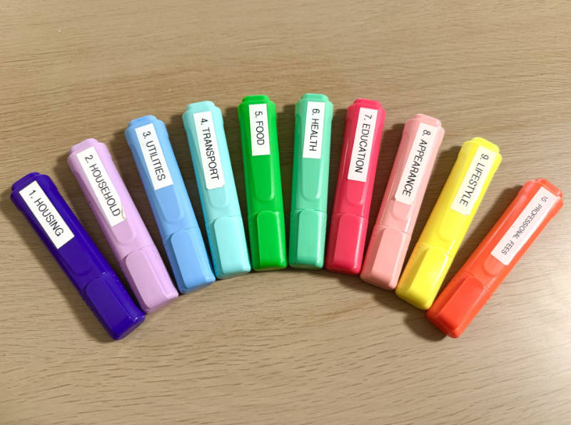 This handy pack includes 10 labelled highlighters to accompany your journey through The Money Diary or Money with Jess book.